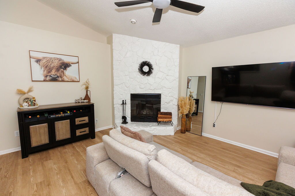 Stunning stone fireplace ( cosmetic only) as a cozy focal point